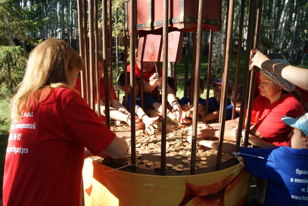 Более 500кг оборудования: ящики, лабиринты, ключи, хранилище с золотом, игровые станции 2*3 метра и тд.